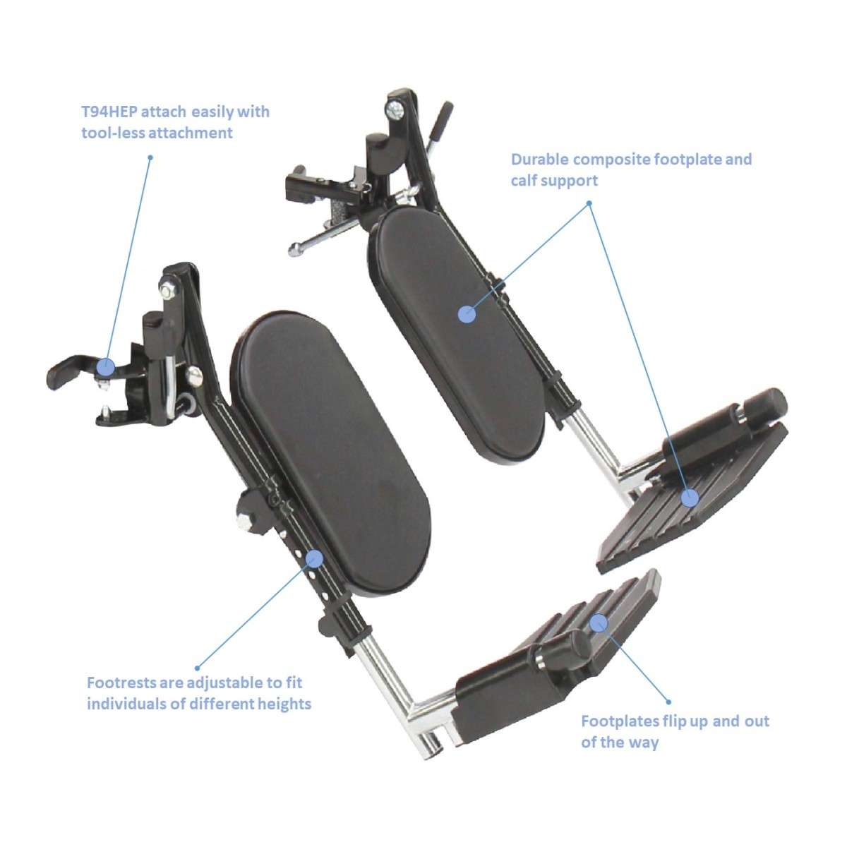 | Invacare Swing Away Footrests with Aluminum Footplates and Heel Loops | Provides foot support and stability, and swings away for ease of transfer | Aluminum with fabric | Adjustable | Users needing durable footrests that can be easily adjusted and swung away for transfers |