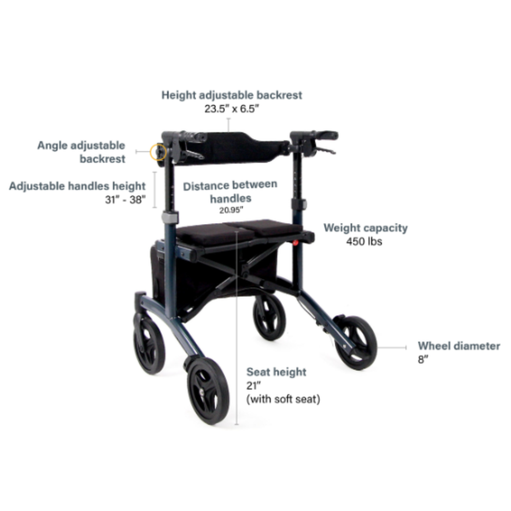 | Triumph Escape HD Rollator | 450 lbs | 20.28 lbs | 20.67″ W | 21″ | 31″ – 37.9″ | 8″ | Aluminum | Heavy-duty yet lightweight walker with chair for daily mobility. |