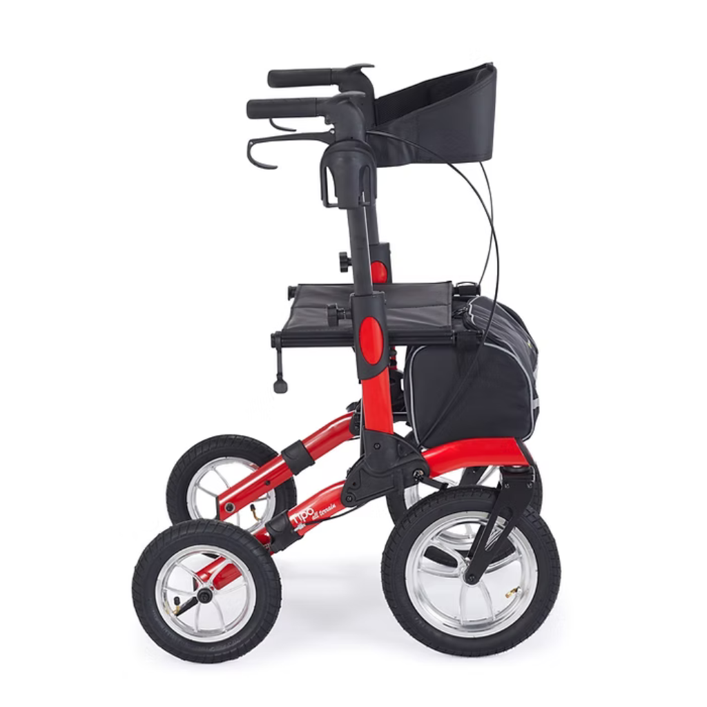 If you need a rollator that performs on grass, gravel, or rough terrain, consider the Comodita Tipo All Terrain Walker or Comodita Uno All Terrain Rollator. These models feature oversized pneumatic wheels, sturdy frames, and high ground clearance for smooth, confident outdoor mobility.