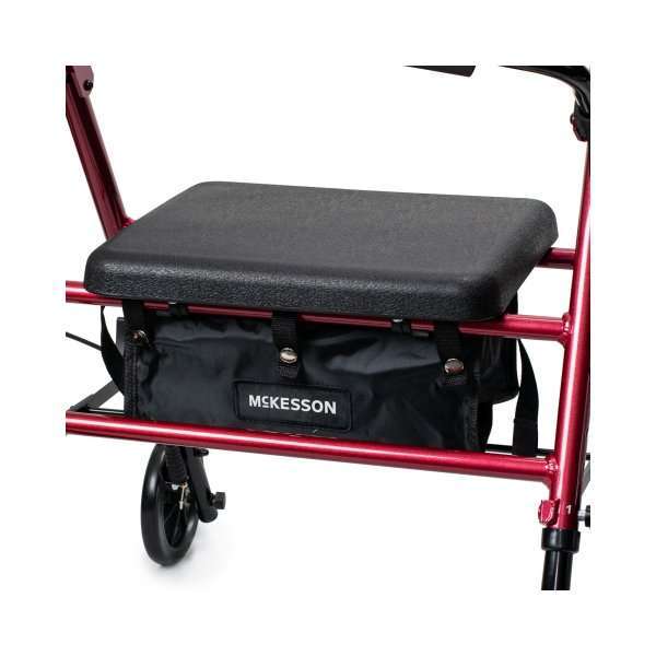 McKesson 4 Wheel Rollator Folding Aluminum Frame: Strong, reliable support with oversized padded seat, deluxe loop-lock brakes, and a secure zippered storage pouch.