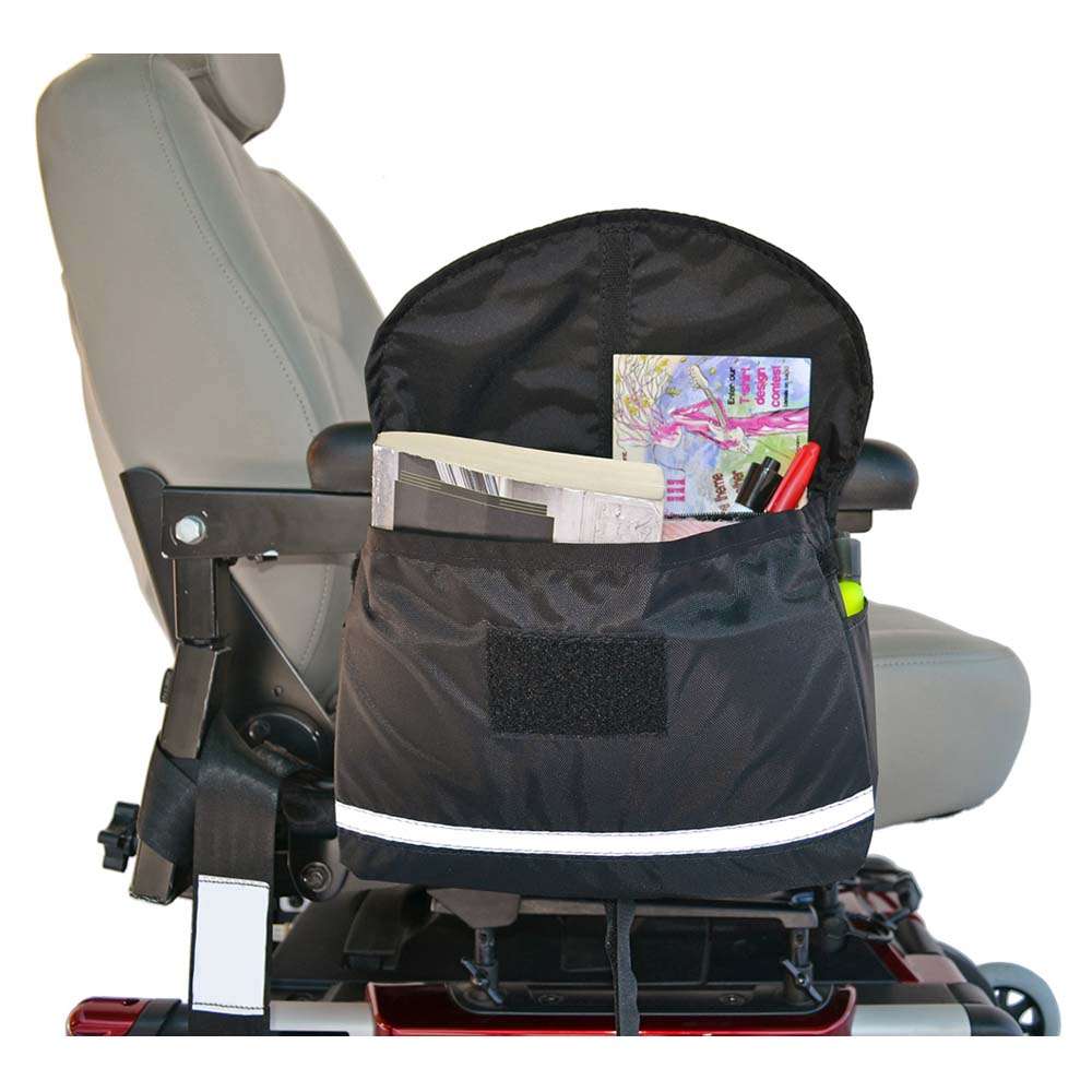 - Straps around your scooter or wheelchair armrest to provide a convenient storage area