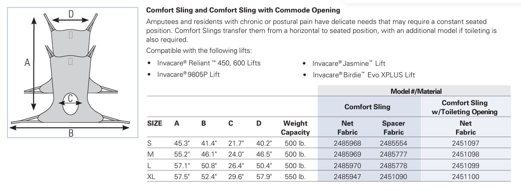 The Invacare Mesh Comfort Sling with Commode Opening is for amputees and users with chronic postural pain with delicate needs that may require a constant seated position. For transfers from a horizontal to a seated position and toileting. Use with the Invacare Reliant 450/600, Jasmine and 9805P Lifts.