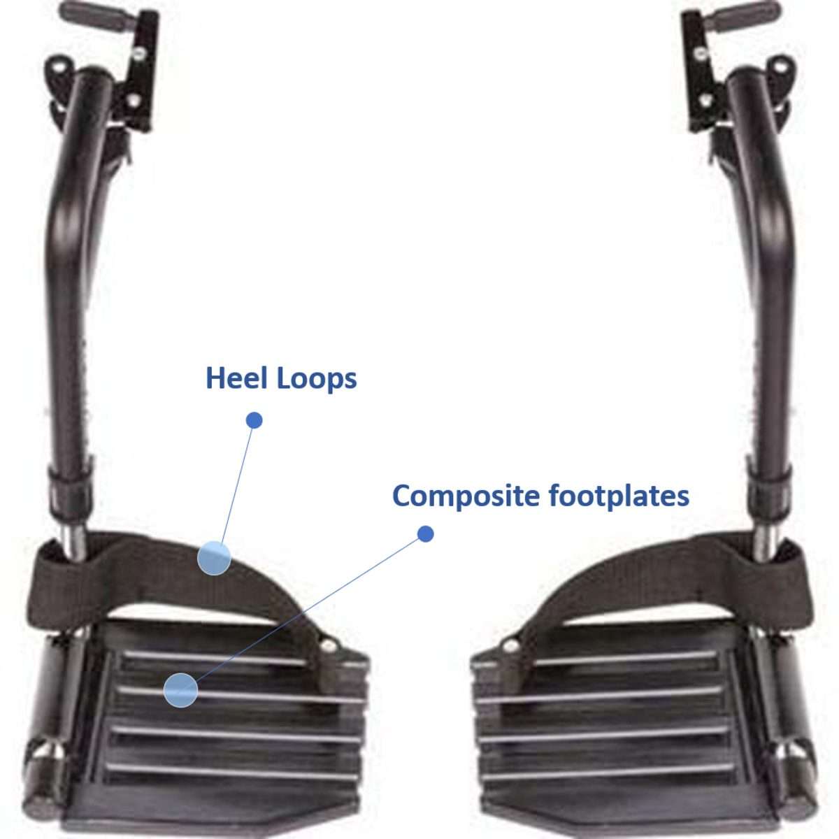 • 1 pair of footrests with durable composite footplates and heel loops.