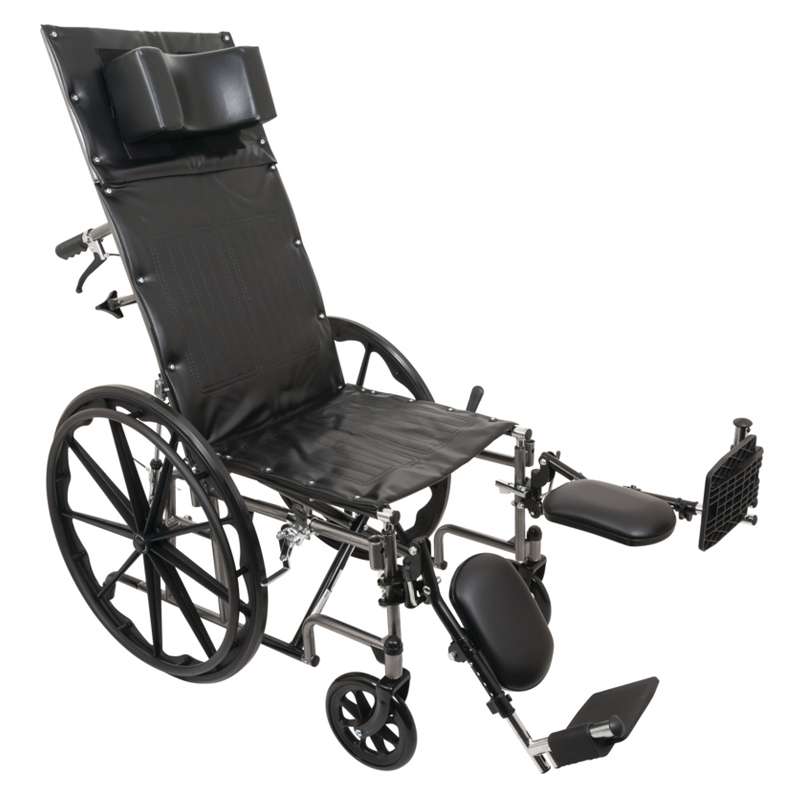 This reclining wheelchair is equipped with full-length padded detachable armrests with side panels, providing support and comfort while also allowing easy transport and access. The swing-away detachable elevating footrests are adjustable in length and come with footplates, enabling users to find the ideal position for their legs, reducing pressure and enhancing circulation. Additionally, an adjustable-height head pillow adds extra support for neck and head, ensuring comfort during extended sitting periods.