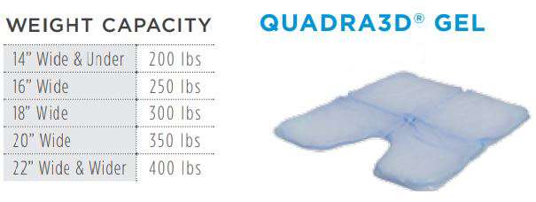 The pressure-relieving Quadra3D gel pack reduces shear forces and heat build-up. Includes four three-dimensional compartments that evenly distributes gel under the seated surface.