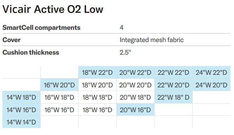 Active O2 offers the combination of an ergonomically shaped foam and Vicair SmartCells. The foam front helps make transfers easier, and the four rear adjustable compartments provide comfort, skin protection, and reduces pressure in the IT/coccyx area. This breathable cushion made with mesh fabric helps you with temperature and moisture control, increases comfort, and is machine washable.